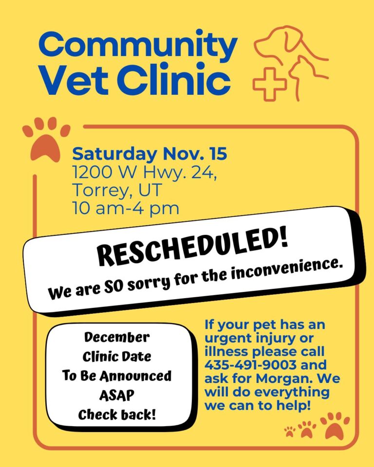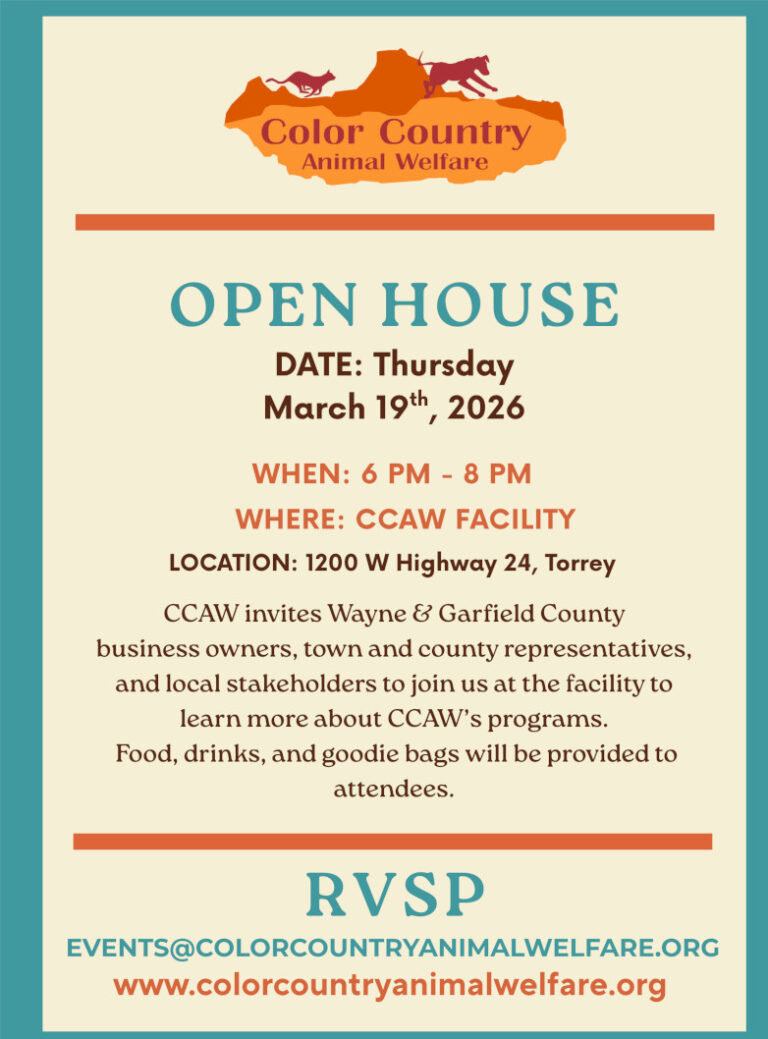 On Saturday May 31st, CCAW is hosting Escalante Community Animal Clinic for spays & neuters, vaccines, preventative care, and illness & injury care for both dogs and cats! For more information, and to schedule an appointment, follow the link below.